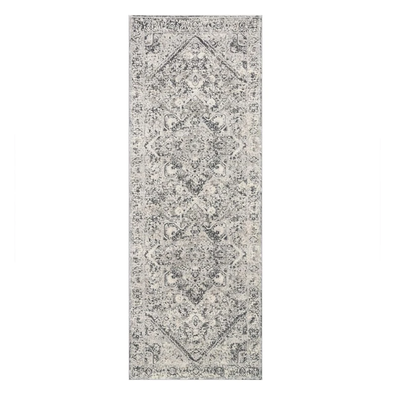 With a weathered, distressed pattern, our dark grey and cream Villa rug has a vintage look and adds class to the home. Intricate detailing makes up the overall bordered medallion pattern of the rug. Perfect as a focal point in a large living room or as an accent piece in a small bedroom, Villa sets a calming foundation. This versatile area rug can go contemporary or traditional; itβs subtle enough to match just about any home decor. Available in 3x5ft. size and a 2x6ft. runner.