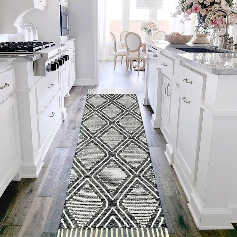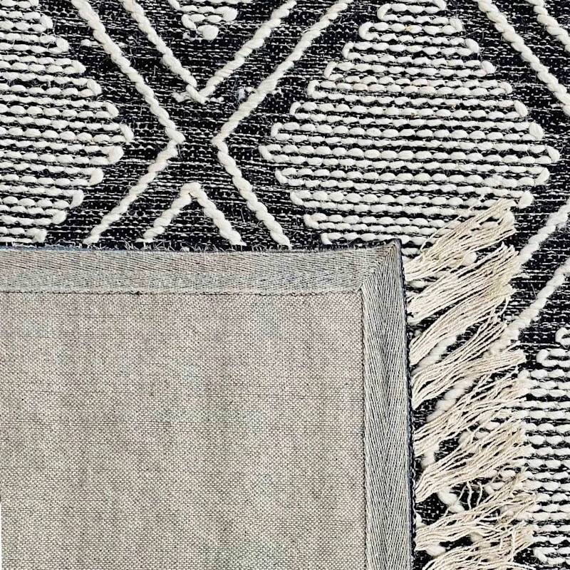 Found & Fable is a new collection that lets you explore what’s right around the corner. Choose your own adventure every day. Savor it all and say yes to what comes next—exclusively At Home. Ready to make its mark in the entryway or a statement under the kitchen table or coffee table, our Goa black diamond global-style cotton area rug is an ideal anchor for any adventurer’s living space. The linked diamond pattern in black and ivory adds to the overall personality of this versatile fringed rug. Available in 3x5ft., 5x7ft. and 7x10ft. sizes and a 2x6ft. runner.