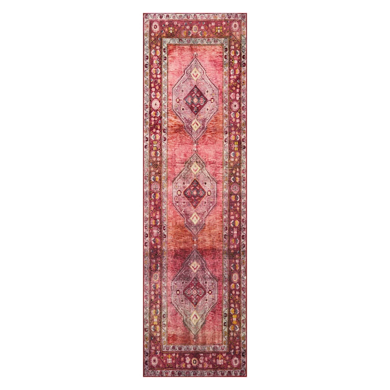 With a colorful, distressed pattern, our Freya red medallion washable area runner rug gives that vintage look and adds class to the home. Intricate detailing makes up the overall bordered medallion pattern of the rug. Perfect as a focal point in a larger living room or as an accent piece in a smaller bedroom, this rug sets a calming foundation. This versatile red multi 2x7ft. area rug can go contemporary or traditional, itβs subtle enough to match just about any home decor.