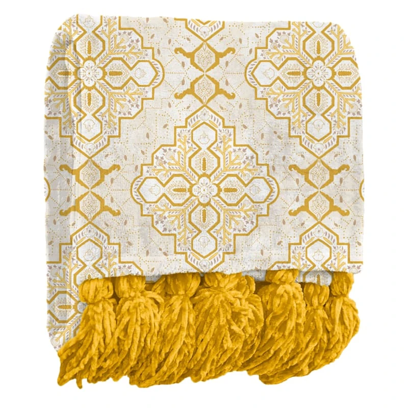Modern farmhouse meets At Home prices in Honeybloom, our exclusive new brand that celebrates life lived together. Our yellow medallion pattern with tassels throw blanket features a wonderful fabric that will keep you warm and toasty. Measuring 50x60in., this luxuriously wonderful throw is large enough to curl up in and has classic year-round style.