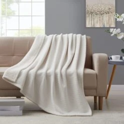 Ivory Chenille Reverse Plush Throw Blanket, 60×60