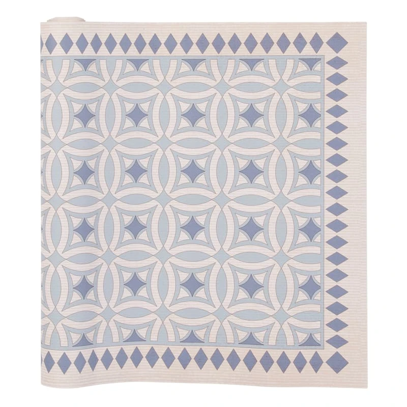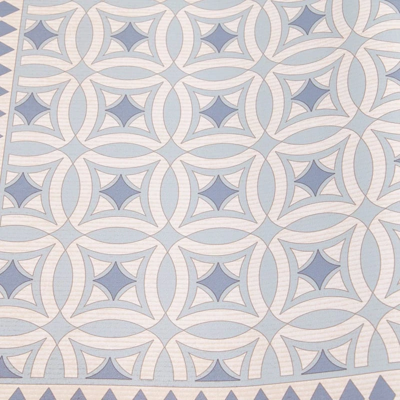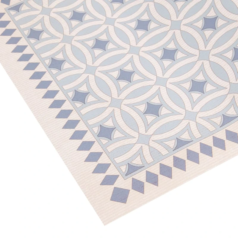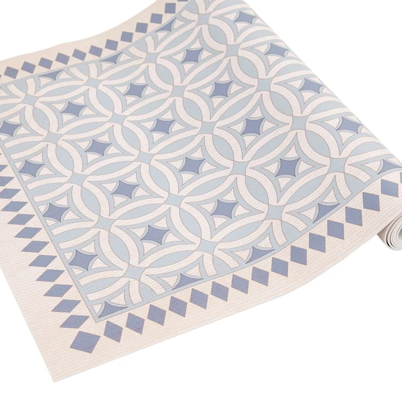 Our charming vinyl beige/blue 2x5ft. accent runner rug is ideal for updated and modern settings, and it helps with noise levels and keeps bare floors nice and comfy. The smooth vinyl and allover medallion tile design offers a nice feeling decorative touch. This wonderful area rug will be comfortable in a contemporary loft or just at home in a modern farmhouse.